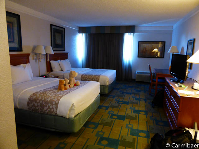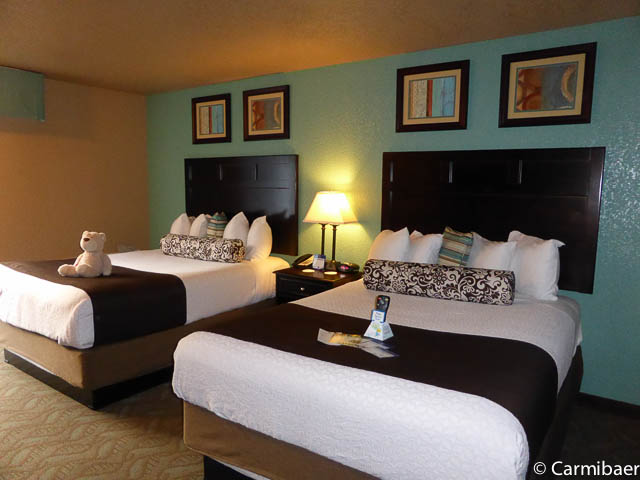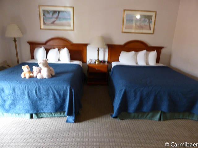 Das Zimmer mit zwei Queenbetten ist recht großzügig und man hat jede Menge Platz. Auch das Bad ist sehr groß. Es gibt hier sogar ein Nachtlicht im Bad, damit man nachts keinen weckt und kein Licht benötigt, denn wie so häufig geht mit dem Licht im Bad der Lüfter mit an und macht Krach. Die Betten sind bequem und es gibt genügend Kissen.