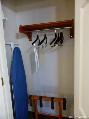 Es gibt eine Kaffeemaschine, eine Mikrowelle, einen Kühlschrank, Bügeleisen und -brett, einen kleinen Schrank und eine Kommode im Zimmer.