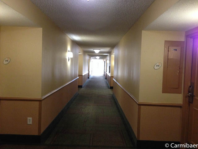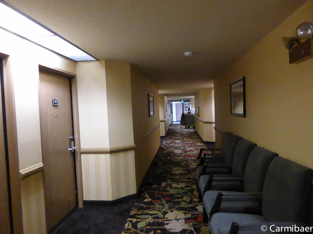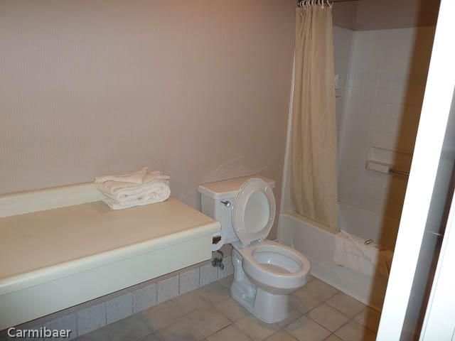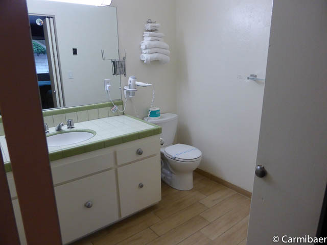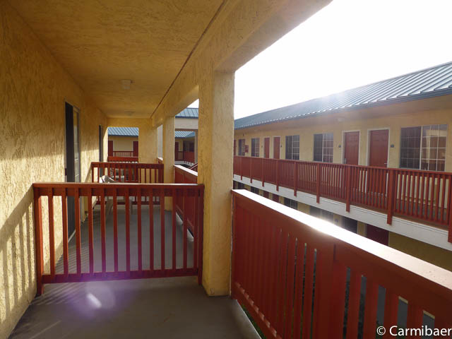 Das Motel hat drei Stockwerke und verfügt über außenliegende Korridore. Die Zimmer sind normale Motelgrösse. Recht dunkel. Mit Kühlschrank, Mikrowelle, Bügelbrett und Bügeleisen, einen Tisch und einen Stuhl. Das Waschbecken befindet sich in Zimmer.