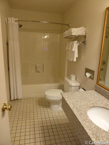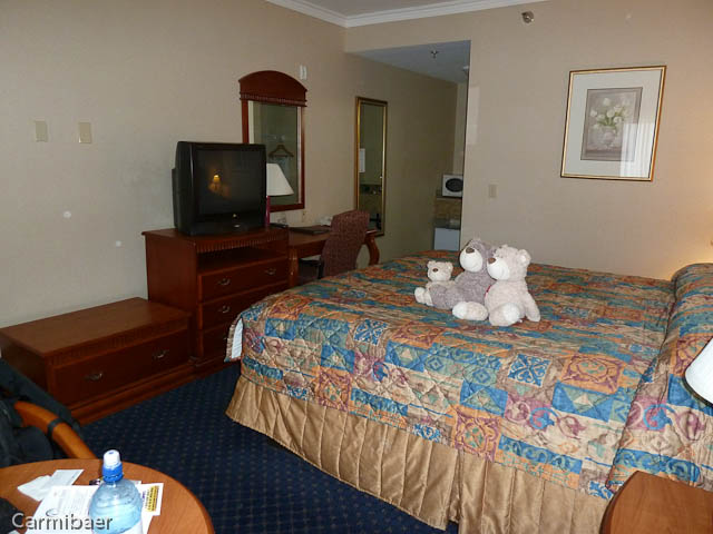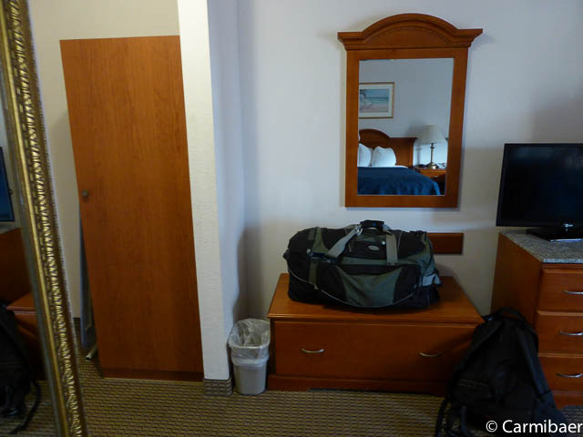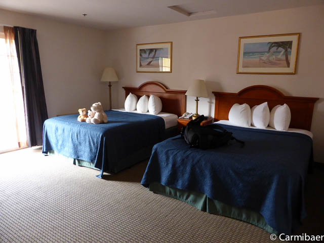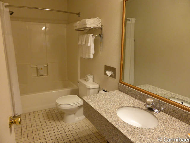Das Motel verfügt über Innenkorridore und gar vier Etagen. Den Aufzug kann man nur benutzen, wenn man seine Zimmerkarte einsteckt. Zweckmäßig ist es eingerichtet. Ein Tisch mit zwei Sesseln, Fernseher, Kühlschrank, ein Waschbecken außen und im Bad ist auch eins. Eine feste Kofferablage ist vorhanden. Das Frühstück ist Motelstandard. Bagel, Fertigwaffeln, Toastbrot, Marmelade, süße Teilchen, Creme Cheese, hartgekochte Eier, verschiedene Säfte, Kaffee. Nix besonderes, aber fürs erste reicht es.