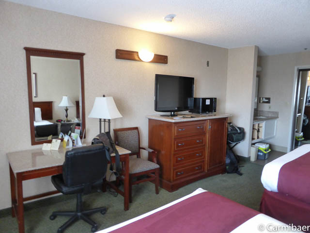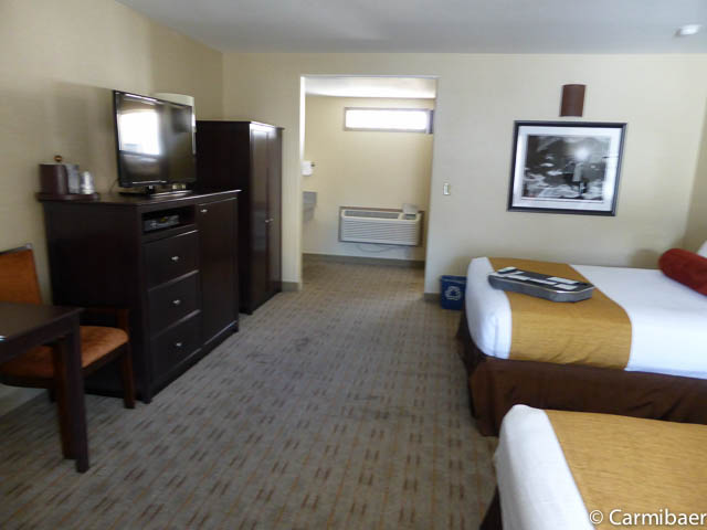 Das Motel verfügt über innenliegende Korridore. Es besteht aus drei Etagen in einem verwinkelten Gebäude direkt an der Interstate. Wir haben von der Interstate aber nichts gehört, da unser Zimmer 90 Grad zur Interstate gelegen ist. Das Zimmer ist recht geräumig. Es gibt in unserem Zimmer keinen Kühlschrank, allerdings gibt es auch Zimmer mit Kühlschrank zu buchen. Eine Kaffeemaschine ist vorhanden. Außerdem gibt es einen Schreibtisch mit Stuhl. Die Betten sind sehr bequem und wir können das Hotel jederzeit empfehlen.