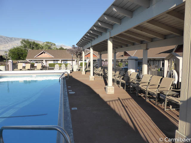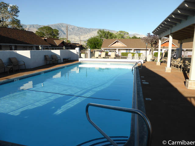 Das Best Western in Lone Pine ist ein nettes Motel. Es besteht aus zwei ebenerdigen Gebäudekomplexen. Parken kann man direkt vor dem Zimmer. In der Mitte der Anlage befindet sich der Pool, der nachts abgedeckt wird. Tagsüber dient die Abdeckung als Sonnenschutz, was wirklich praktisch ist. Die Zimmer sind sehr gemütlich eingerichtet. Wir hatten das Glück ein Tageslichtbad zu haben, was nicht wirklich häufig ist. Waschmaschinen und Trockner gibt es hier auch. Auf dem Zimmer gab es wieder ein Bügeleisen mit Bügelbrett, einen Kühlschrank, Kaffeemaschine und ne Mikrowelle. Die Klimaanlage war sehr praktisch angebracht, da sie keinem direkt aufs Bett bläst. Das Frühstück wurde in der Lobby eingenommen. Es gab 7 Tische direkt im Raum und noch zwei noch im Rezeptionsbereich, die alle voll besetzt waren. Die Auswahl ist reichhaltig. Es gibt versch. Säfte, Tee, Kaffee, Toast, Waffeln, Eier, Creme Cheese, Butter, Marmelade, Obstsalat aus der Dose, Äpfel und Bananen, Muffins, Gravy und Cereals.