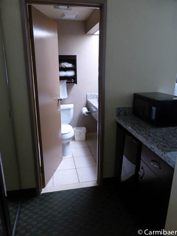 Die Zimmer sind sehr großzügig und wir haben ein Zimmer mit Mikrowelle und Kühlschrank gehabt. Außerdem gibt es noch eine Kaffeemaschine, wie ein Bügelbrett und -eisen. Es gibt noch einen Tisch mit zwei Stühlen, zwei Gläser und div. Pappbecher. Das Waschbecken ist im Vorraum zum Bad. Die Betten sind bequem und wir können dieses Best Western empfehlen. Es ist auch sehr ruhig, da die Gebäude etwas von der Hauptstrasse zurück versetzt stehen. Durchaus könnte man hier die Fenster offen lassen, da bei uns auch ein Fliegengitter angebracht ist.