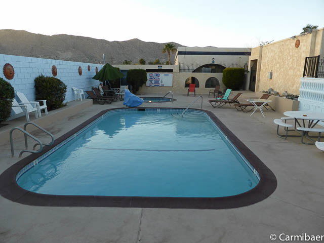 Das Motel besteht aus verschiedenen Gebäudekomplexen, die zweistöckig sind. Die Zimmer sind über aussenliegende Korridore erreichbar. Die Zimmer sind etwas düster und altbacken eingerichtet, aber groß und sauber. Es gibt einen Kühlschrank, eine Mikrowelle und eine Kaffeemaschine. Es gibt einen Schreibtisch mit Stuhl und einen zusätzlichen Sessel im Zimmer. Das Bad ist im hinteren Teil des Zimmers und durch eine doppelseitige Tür getrennt, die allerdings nicht ganz dicht ist. Insgesamt hatten wir ein großzügiges Bad mit Badewanne. Einen Föhn gibt es hier auch. Wir hatten das Motel fast für uns alleine, deswegen war es schön ruhig dort. Der Poolbereich ist mit Liegen ausgestattet. Frühstück gibt es hier nicht wirklich. Ein paar Bananen und süsse Teilchen gab es am Morgen. Nix für uns. Aber bei dem unschlagbar günstigen Preis von 100 EUR für zwei Nächte ist uns das egal. Wir haben das Hotel über ein Buchungsportal gebucht, da es günstiger als direkt über die Homepage war. Als Ausgangsort für den Joshua Tree kann man den Ort empfehlen. Für einen solch günstigen Preis kann man hier nächtigen.