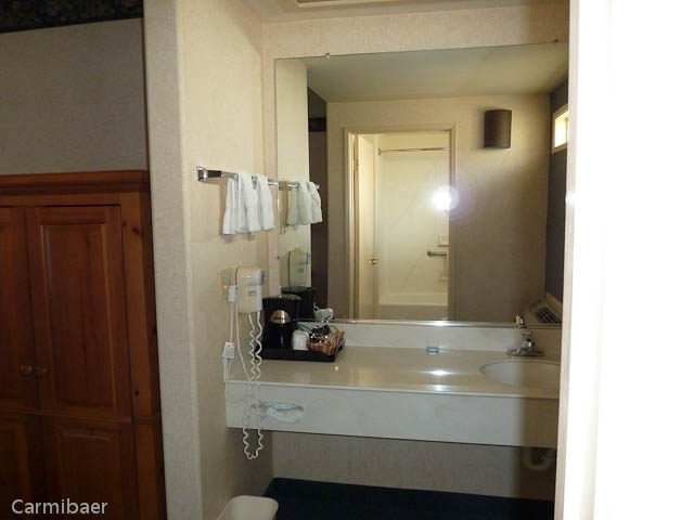 Das Zimmer ist sehr geräumig. Es hat noch einen Sessel mit Hocker, einen Schreibtisch mit Stuhl, Bügelbrett mit Bügeleisen, Ablage für die Koffer. Das Waschbecken ist aussenliegend, sprich im Zimmer. Es gibt einen Kühlschrank, eine Mikrowelle und eine Kaffeemaschine.