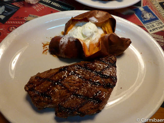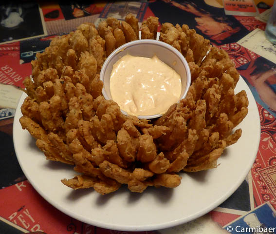 Es gibt heute ein Spezial. Das 11 oz. Steak für 9,99 $ anstelle von 14,99 $. Eigentlich wollten beide nur ein 8 oz. Steak essen, aber das wäre teurer gewesen. Na ja, es hat ja schließlich geschmeckt. Vorher gab es noch eine fritierte Zwiebel. Auch diese war lecker. Und das Ganze war noch günstiger als beim Outback Steakhouse.