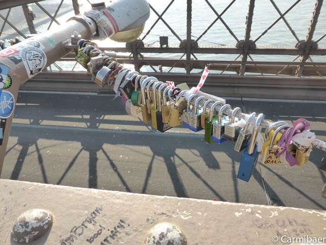Unterhalb der Brooklyn Bridge gibt es eine kleine Plattform, wo auch ein paar Schlösser angebracht sind. Dies erinnert uns irgendwie an Köln. Das ist wohl im Moment groß in Mode, dass man Schlösser an Brücken befestigt und den Schlüssel dann ins Wasser wirft, um seine Liebe für die Ewigkeit zu besiegeln.