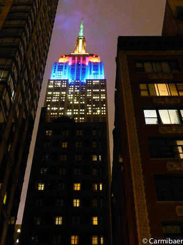 Danach geht es leicht durchnässt zum Trocknen ins Hotel. Carmen hat schon ihre Tasche gepackt und Michi hat die letzten Bilder gesichert. Und heute ist das Empire mal in anderen Farben angestrahlt. Das wurde dann gleich auch nochmal aufgenommen. Aber nur aus dem Fenster. ![]()