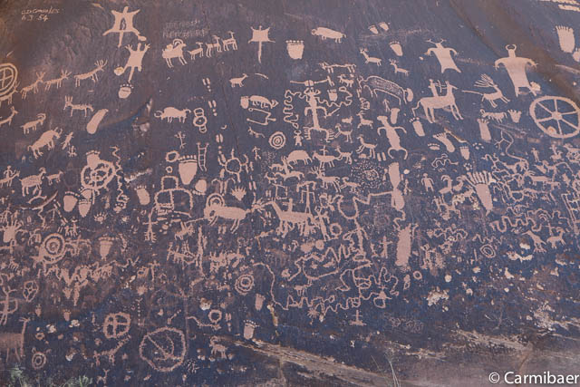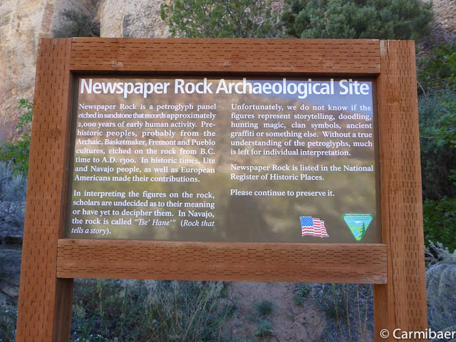 Unser erster Halt ist am Newspaper Rock State Historical Monument. Dort haben wir auch das richtige Licht erwischt, denn die Felszeichnungen liegen noch schön im Schatten und somit können wir sie gut ablichten.