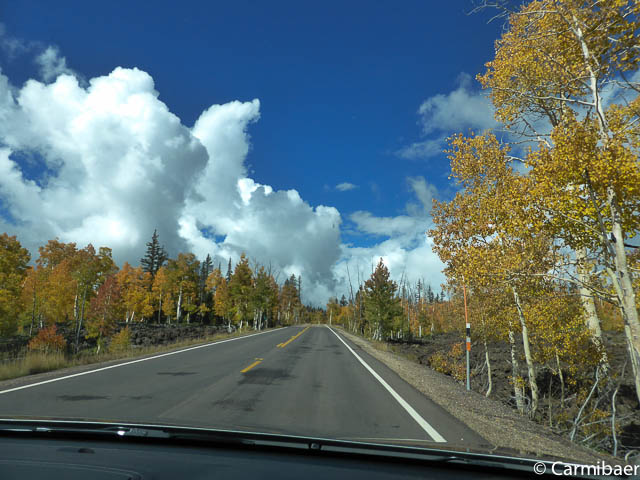 Weiter geht es nach unserer Frühstückspause, die wir hier auf dem Parkplatz gemacht haben, zu Cedar Breaks. Unterwegs gibt es wieder tolle Herbstfarben.