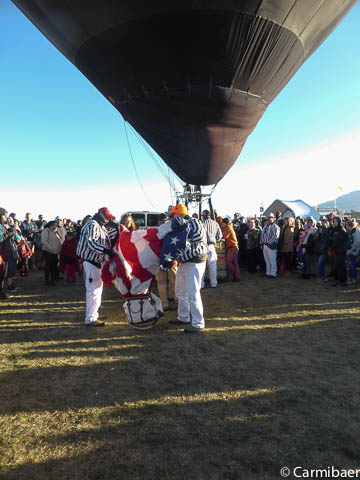 Dann gehen wir weiter und bleiben möglichst wenig stehen, da es so kalt ist. Irgendwann erfahren wir dass wohl gegen 7:30 h bekannt gegeben wird, ob heute überhaupt was stattfindet. Es windet viel zu stark. Dann wird ein Ballon startklar gemacht. Das ist gar nicht so einfach, denn der Wind ist so stark, dass man mit der Flamme echt aufpassen muss.