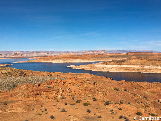 Wir fahren noch beim Visitorcenter in Big Water vorbei, aber leider hat es dienstags und mittwochs geschlossen. So gibt es kein letztes Rangerbild mehr. Danach fahren wir noch kurz Richtung Marina, um ein schönes Bild vom Lake Powell zu bekommen.