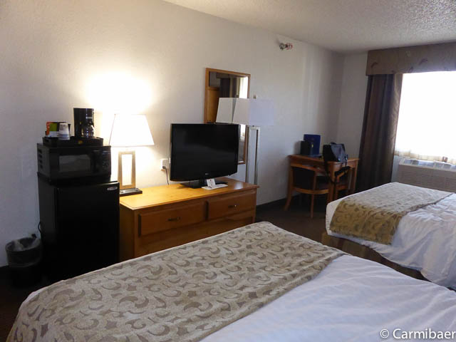 Das Motel ist schon etwas älter und renovierungsbedürftig in unseren Augen. Das Motel wird von vielen Bauarbeitern genutzt. Das Zimmer ist recht großzügig und ausgestattet mit Kühlschrank, Mikrowelle, Kaffeemaschine. Sauber war es, aber eben abgenutzt. Es gibt noch einen Tisch mit zwei Stühlen. Leider hat unser Zimmer eine Verbindungstür, allerdings hört man nicht wirklich etwas vom Nebenmann. Eher hört man draussen die Leute auf dem Gang laufen bzw. die Türen zuschlagen. Aber das ist ja üblich in vielen Motels, dass sie hellhörig sind. Es gibt einen Aufzug, allerdings endet dieser irgendwie meistens eine halbe Etage höher oder niedriger. Es gib drei Etagen und nur innenliegende Korridore. Es gibt einen Indoorpool und das WLan hat auch gut funktioniert.
