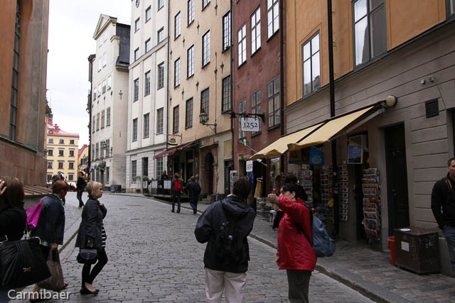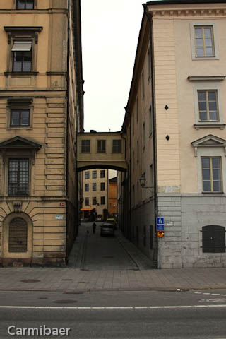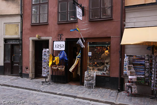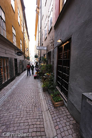 Die engste Gasse Stockholms ist die Marten Trotzigs Gränd. Sie ist nur 90 cm breit. Man vermutet überhaupt nicht eine Gasse zwischen den zwei Häusern. Wenn nicht soviele vor uns dort stehen geblieben wären hätten wir sie wahrscheinlich erstmal übersehen.