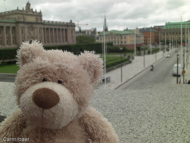 Weiter ging es Richtung königlichem Schloss. Allerdings haben wir erst kurz Halt am Reichstagsgebäude, dem Riksdagshuset gemacht. Das Gebäude liegt auf der Insel Helgeandsholmen, die man über zwei Brücken bequem erreichen kann. Es wurde zwischen 1897 und 1905 erbaut. Im westlichen Anbau des wuchtigen Reichtagsgebäude war ursprünglich die Reichsbank untergebarcht. Heute befindet sich dort der Plenarsaal des Parlaments.