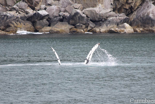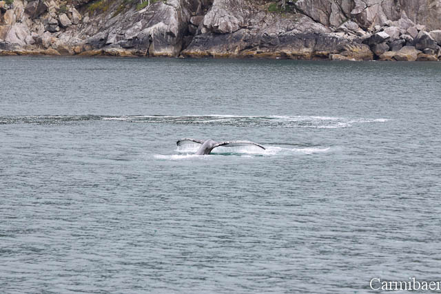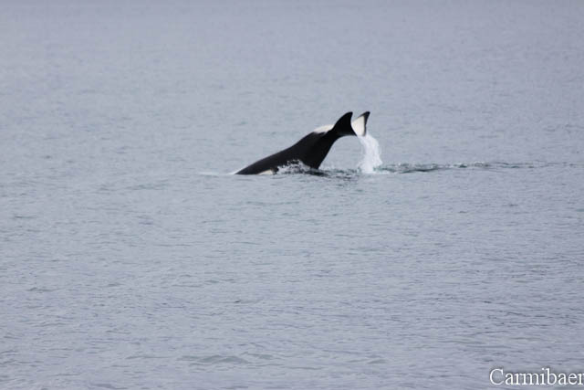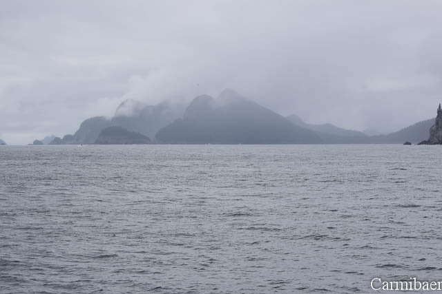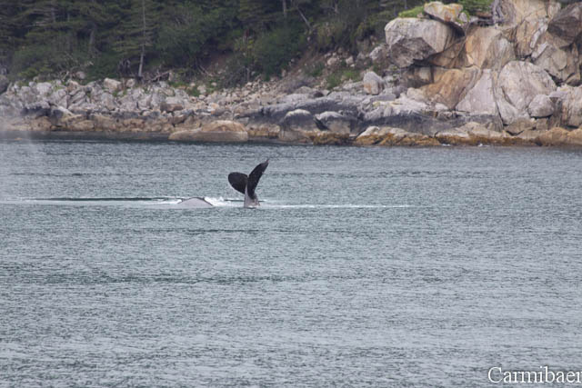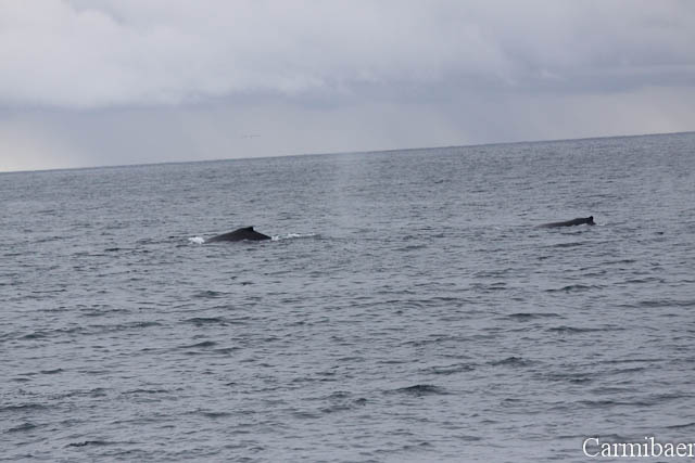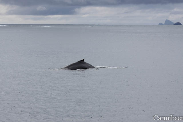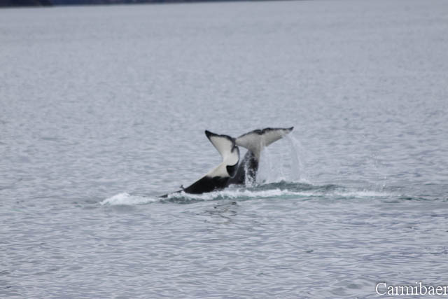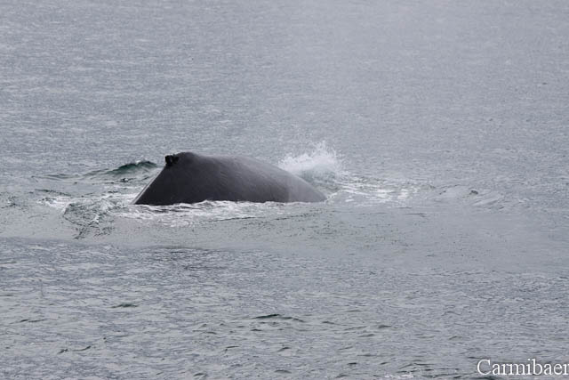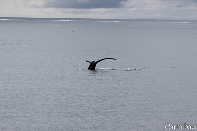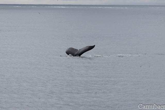 Zwischendurch war noch ein Buckelwal zu beobachten. Schön, wie die Flosse so aus dem Wasser gewunken hat. Aber wie ihr sehen könnt ist das Wetter echt nicht schön, aber für die Tiere einfach toll. Carmen jedenfalls hat es so viel besser gefallen, als wenn strahlender Sonnenschein gewesen wäre und keine Tiere.
