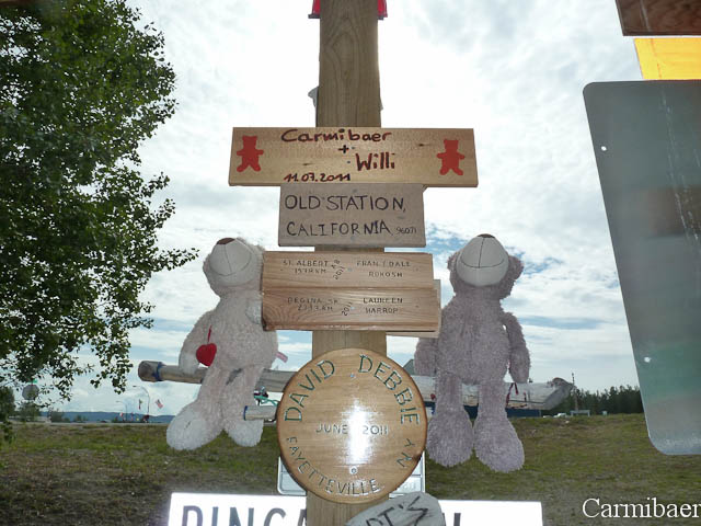 Aber bevor es soweit war haben wir kurz hinter Watson Lake erstmal einen Schreck bekommen, als es merkwürdige Geräusche gab. Wir dachten sofort an einen Platten. Sind rechts rangefahren und Knut und Carmen haben das Auto inspiziert. Sie konnten aber nichts feststellen. Auch die Reifen hatten alle noch Luft. So sind wir dann weitergefahren und haben gehofft in Whitehorse anzukommen.