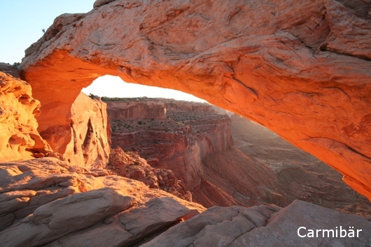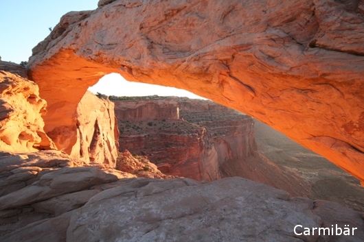 Der Wecker hat um 5.10 h geklingelt. Das ist wirklich eine unchristliche Zeit. Ich wollte mit Knut noch ein wenig im Bett bleiben, aber die Carmen war unerbittlich und hat uns rausgescheucht. Wir wollten ja schließlich pünktlich zum Sonneaufgang am Mesa Arch sein. Aber eigentlich hätten wir noch ein wenig früher losfahren sollen, damit wir einen besseren Platz zum Fotografieren bekommen. Werden wir uns für das nächste Mal einfach merken und die Carmen muss uns einfach aus dem Bettchen schmeißen, dann klappt das bestimmt.