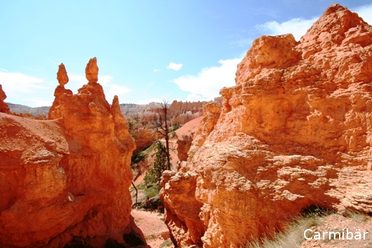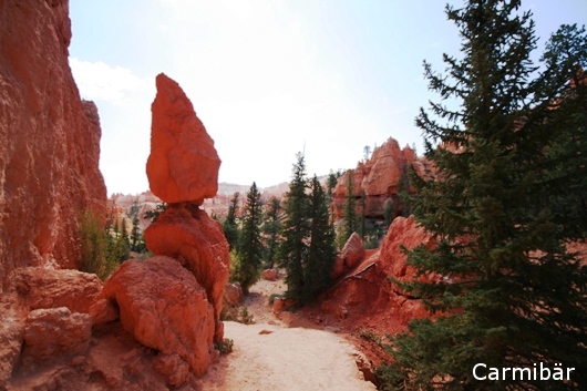 Wir mussten erstmal einen Parkplatz suchen, da es ziemlich voll war. Aber wir hatten Glück und es fuhr gerade jemand weg und da ist die Carmen doch glatt ganz schnell in die Parklücke gehuscht. Dann haben wir unser sieben Sachen zusammen gesucht und haben uns auf den Weg zum Navajo Trail gemacht. Wenn man sich mal die anderen Leute angeschaut hat, die da versucht haben diesen Trail zu laufen kamen meine Eltern gar nicht mehr aus dem Staunen raus. Manche hatten noch nichtmal einen Schluck Wasser dabei und andere sind mit ihren Sandaletten dort hinunter gelaufen.