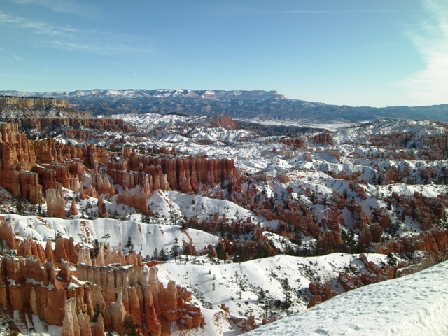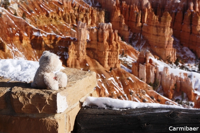 Die Landschaft unterwegs war echt schön anzusehen mit den gepuderten Bergen und den gepuderten Wiesen. Die Straßen waren glücklicherweise frei, denn soviel hatte es ja am Vortag dann doch nicht geschneit. Aber man merkte schon, dass am Straßenrand doch mehr Schnee lag, als auf der Hinfahrt zum Bryce Canyon. Leider gibt es von hier keine Bilder, denn Carmen ist gefahren und Knut hat keine Fotos gemacht.