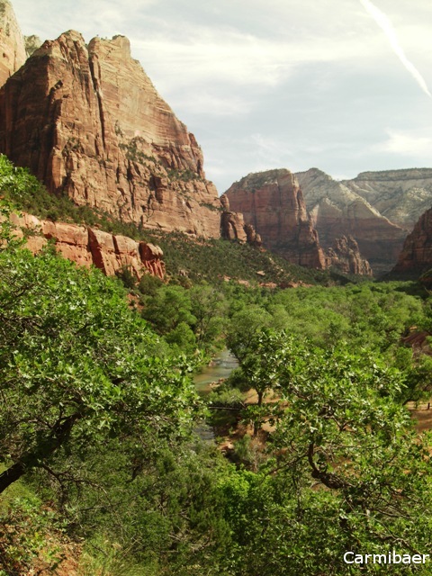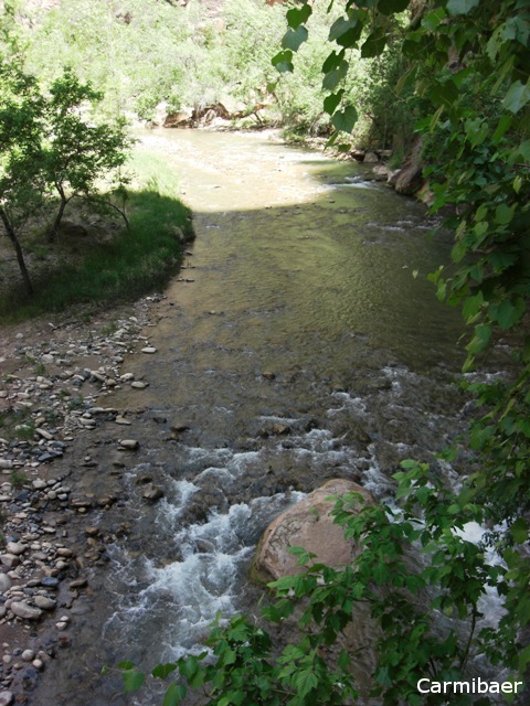 Um ca. 11.30 h waren sie dann wieder an der Lodge. Dort haben sie es sich erstmal auf einer Bank gemütlich gemacht. Denn es ist heute doch wieder ziemlich warm. Allerdings nicht ganz so wie gestern. Das ist auch gut so. Nach ca. ner halben Stunde oder früher sind sie mit dem Shuttle bis zum Temple of Sinawawa gefahren, um dort den Riverside Walk zu laufen. Für den Nachmittag waren mal wieder Regenfälle angekündigt und somit wollen sie doch das schöne Wetter noch ausnutzen, solange es geht. Der Riverside Walk war schon ziemlich überlaufen, aber noch ging es. Am Ende angekommen, haben sie die Leute beobachtet, die versucht haben durch den Fluss zu laufen. Aber leider ist keiner zur Belustigung baden gegangen, obwohl es schon ein paar merkwürdige Verrenkungen gab. ![]()