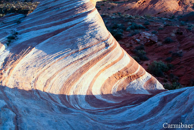 Wir sind auch bis zur Firewave vorgedrungen. Davon haben wir in Tombstone das erste Mal gehört bzw. Carmen, denn ein anderes deutsches Pärchen hatte den Reise Know How Reiseführer „Der ganze Westen“, wo als Titelbild die Fire Wave abgebildet ist. Der Weg war gar nicht so schwierig zu finden. Wenn man auf dem ersten Parkplatz kommend vom White Pass parkt und dann noch ein Stück Richtung Visitor Center läuft geht es dann auf der linken Seite rein. Dort noch ungefähr eine halbe Meile laufen und sich nach rechts halten und schon ist man da. Kurz bevor wir von der Straße abgebogen sind hat ein Auto angehalten und der Beifahrer sprach uns auf Englisch an, ob wir wüssten wo die Fire Wave ist. Knut hat dann mal gleich auf Deutsch geantwortet, dass sie wohl da unten sein müsste. Der Mann war schon verdutzt, warum wir wüssten, dass er deutsch spricht. Na ja, wer sollte sonst auf die Idee kommen. Außerdem hatte Knut den Reiseführer im Auto gesehen.