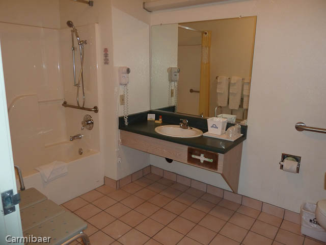 Die Zimmer im Days Inn sind sehr groß, aber das könnte auch daran liegen, dass wir ein Rollstuhl gerechtes Zimmer bekommen haben. Das Bad ist total riesig. Was mich nur ein wenig stutzig gemacht hat, ist die Tatsache, dass es dort keinen Schrank gibt aber die Kleiderstange im Bad hinter der Tür angebracht ist. Wer hängt denn da seine Klamotten hin, wenn man dort duscht.