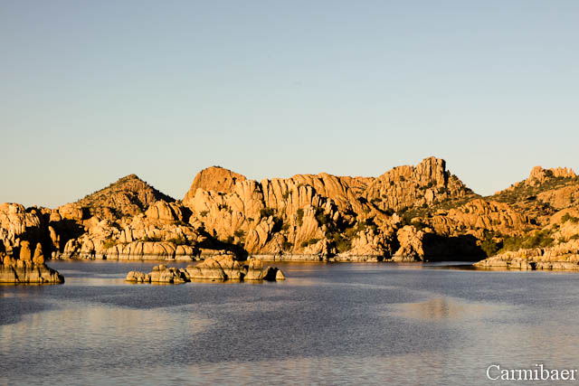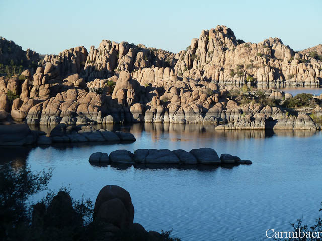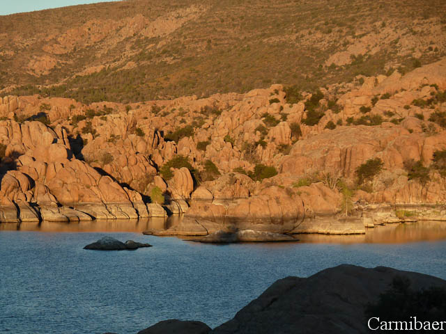 In Prescott angekommen sind wir nochmals zum Watson Lake gefahren. Wir wollten es nochmal versuchen dort ein paar Bilder zum Sonnenuntergang zu machen. Egal, ob dort ein Festival ist oder nicht. Und was soll ich sagen. Für 2 $ durften wir auf den Parkplatz fahren, um dann zum See zu gelangen. Wir durften parken wo wir wollten. Da hatten wir anscheinend mehr Glück als gestern Rainer. Der Weg war allerdings, trotz Trail, etwas eigenartig. Eigentlich sollte das ein Biketrail sein, Carmen weiß nur nicht, wie man dort wirklich mit dem Rad fahren soll. Es waren zum Teil sehr viele Steine dort und auch das Gestrüpp war sehr eng verzweigt. Knut hat sich bis runter zum See durchgeschlagen und hat von weiter unten ein paar schöne Bilder gemacht. Carmen hat sich das nicht so getraut und ist weiter oben geblieben und hat dort auch ein paar schöne Ausblicke genießen können. Ab und an hat man ein paar Klänge von dem Festival gehört, aber das hielt sich glücklicherweise in Grenzen.