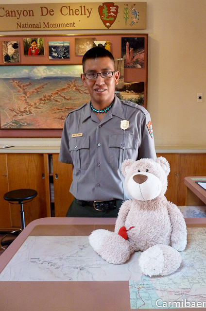 Am Parkeingang war ein super lieber Ranger. Er hätte mich gerne bei sich behalten, aber das wollte ich nicht. So sind wir dann bis zum Visitorcenter gefahren, haben uns einen Stempel abgeholt und ich habe mich mit Carmen brav in die Reihe angestellt, damit wir mit dem Ranger ein Bild machen konnten. Hier im Visitorcenter gibt es die Tickets für die Besichtigungstouren der Häuser zu kaufen. Aber das wollten wir nicht. Waren ja schon vor ein paar Jahren hier und das hat irgendwie gereicht.
