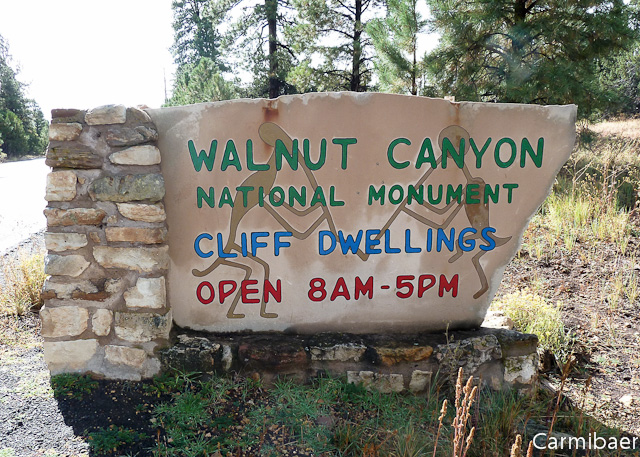 Danach geht es um ca. 10.00 h zum Walnut Canyon. Im Moment regnet es mal nicht. Aber es sind immer noch dunkle Wolken am Himmel, obwohl zwischendurch auch mal die Sonne hervorblitzt. Kurze Zeit später sind wir am Eingangsschild angekommen und wir haben Glück. Die Steine sind abgetrocknet und so können wir uns in Pose setzen. ![]()