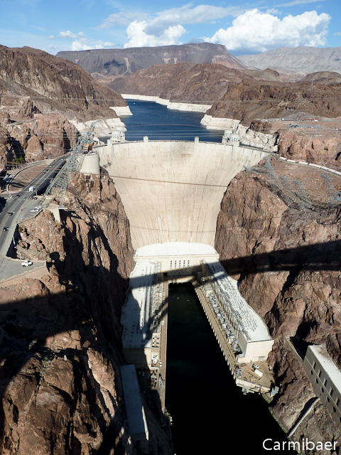 Der nächste Halt war dann am Hoover Dam, nachdem wir über die neue Brücke gefahren sind. Vor der Brücke sind wir kurz abgefahren. War auch echt Glück, denn Carmen wollte die Überfahrt filmen und gerade da war der Akku leer. Schnell den neuen eingelegt und weiter geht es. Knut, Carmen und der Glücksbär sind dann hoch auf die Brücke, um einen Blick auf den Damm zu werfen, denn bei der Überfahrt sieht man absolut gar nix. Wir hatten auch Glück mit einem Parkplatz, denn es war echt voll hier. Aber gerade vor uns ist ein anderes Auto rausgefahren und wir waren sogar ziemlich weit vorne und der Weg war so ein paar Meter kürzer.