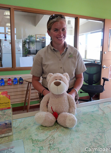 Am Visitorcenter, das auch gleichzeitig der Parkeingang ist, haben wir nochmal Halt gemacht und es gab noch ein nettes Bild mit der Rangerin. Sie fand mich ausserordentlich süss, wie sie mir gesagt hat. Ich hab ihr gleich mal meine Karte da gelassen, damit sie mich noch öfter anschauen kann. ![]()