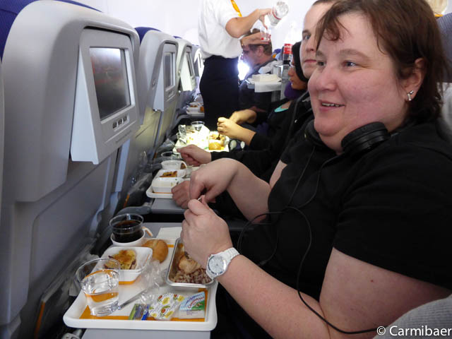 Um 13.45 h sind wir dann mit ca 15 min Verspätung gelandet. Aus dem Flieger waren wir um 14.05 h. Da Carmen während dem Flug nicht rumgelaufen ist, haben wir nur beim rausgehen die Treppe nach oben gesehen. Es waren zwischen den einzelnen Reihen, sprich ungefähr immer nach 10, Vorhänge und durch die Galley wollte sie nicht immer laufen. Manche Stewardessen haben eh komisch geschaut, aber alles in allem waren sie total nett und lustig drauf. Gerade schon als es um die Essensverteilung vom zweiten Essen ging. Sie hatten sich bei der gewagten Kombination schon gewundert und dachten, glücklicherweise ne gute Stunde vorm Landen.