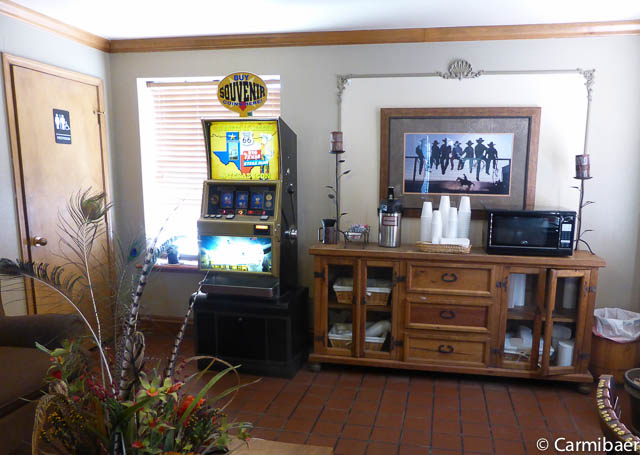 Die restlichen ca. 40 Meilen bis Amarillo haben wir dann auch schnell geschafft und das Big Texan Motel haben wir auch schnell gefunden. Kurz eingecheckt, Bilder vom Zimmer gemacht und gleich mal wieder an die Rezeption und ein neues Zimmer verlangt, weil mal wieder ein Bettlaken beschmutzt war. Wohl war es frisch gewaschen und die Flecken werden nicht rausgehen, aber eklig ist sowas ja schon. Das nächste Zimmer sieht etwas anders aus bzw. die Amaturen im Bad sind schon sehr fragwürdig, aber es funktioniert alles und die Betten sind auch sauber.