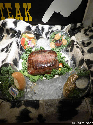 Es haben sogar vier Leute bzw. drei Leute oben auf dem Podest gesessen und ein 72 oz Steak versucht zu verdrücken. Hier mal ein Bild von dem, was sie in einer Stunde schaffen müssen.