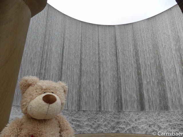 Ich bin im Auto geblieben, aber der Glücksbär hat es vorgezogen mit in die Schwüle und zur Wand zu gehen.