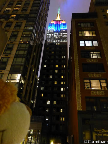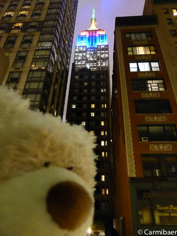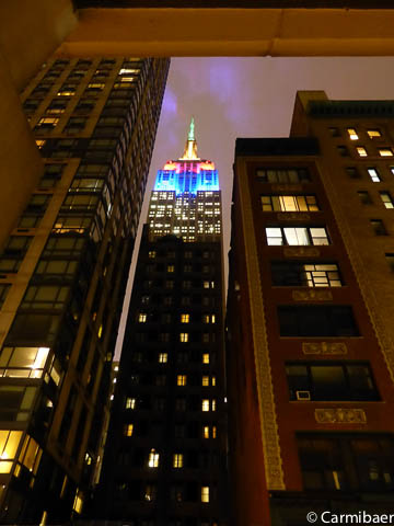 Danach geht es leicht durchnässt zum Trocknen ins Hotel. Carmen hat schon ihre Tasche gepackt und Michi hat die letzten Bilder gesichert. Und heute ist das Empire mal in anderen Farben angestrahlt. Das wurde dann gleich auch nochmal aufgenommen. Aber nur aus dem Fenster. ![]()