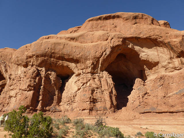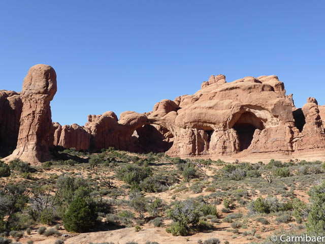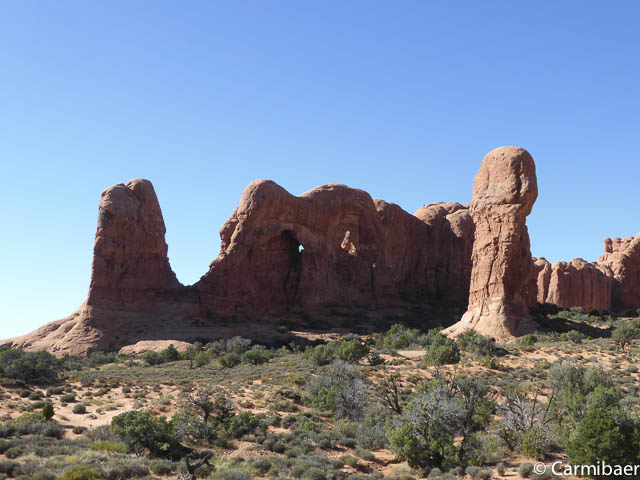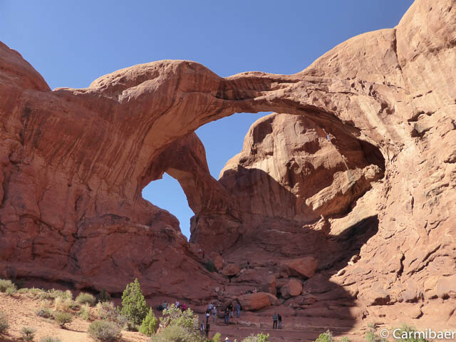 Kaum am Auto angekommen sind wir zur Windows Section aufgebrochen. Dort hatten wir Glück mit einem Parkplatz, was in Anbetracht der hier sogar verkehrenden Reisebusse gar nicht so einfach ist. Die kurze Wanderung oder vielmehr der kurze Spaziergang zum Double Arch ist auch schnell vollbracht, nur die Fotos nicht, da gerade eine japanische oder chinesische Reisegruppe dort rumturnt.