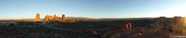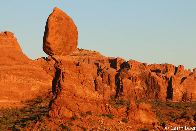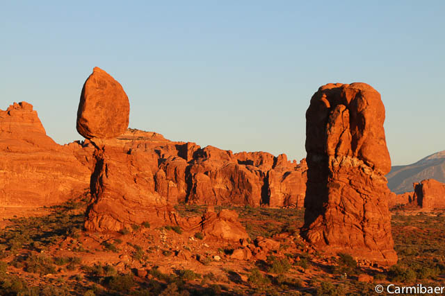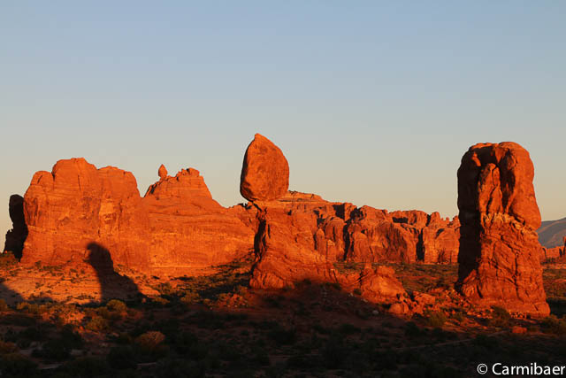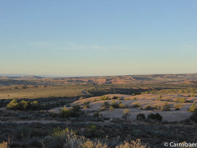 Gegen 18 h sind wir in den Arches N.P. zum Sonnenuntergang aufgebrochen. Wir haben uns den Balanced Rock ausgesucht und sind kurz vorm Parkplatz links auf die Dirtroad abgebogen, damit wir von dem kleinen Hügel gegenüber ein paar nette Bilder machen können.