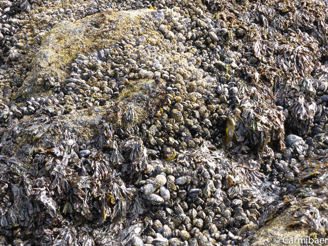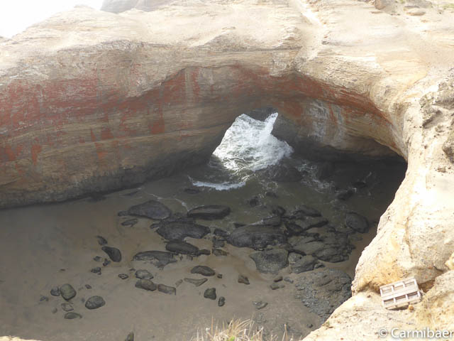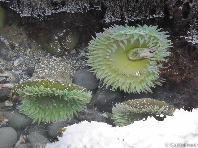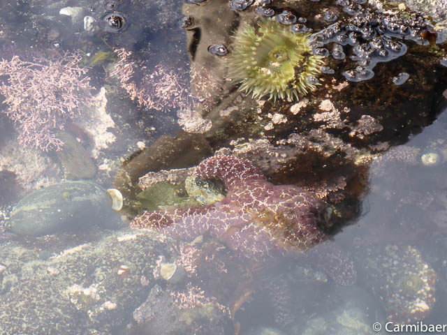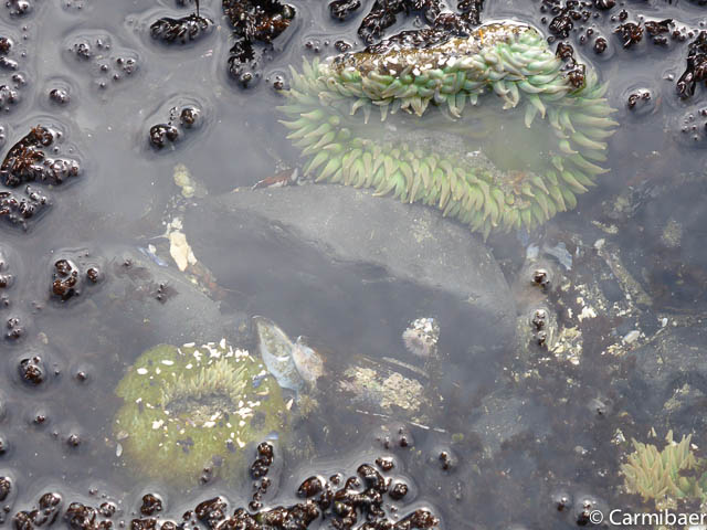 Dann hat sich Carmen auf den Weg zum Strand und den Tide Pools gemacht, denn wir haben Glück und es ist gerade Ebbe. Somit können wir hier hoffentlich ein paar nette Meerestiere und Pflanzen sehen. Der Weg hinunter geht über eine lange Treppe. Unten angekommen muss man sich durch einen Steinstrand schlagen. Das ist nicht so einfach, denn es geht einen Hügel hinunter. Trotz Carmen die Turnschuhe an hat, knickt sie das ein oder andere Mal um, aber zum Glück nicht schlimm. Nervig ist das blöde laufen dort aber schon. Aber es hat sich gelohnt, denn es gibt ein paar schöne Dinge zu entdecken.