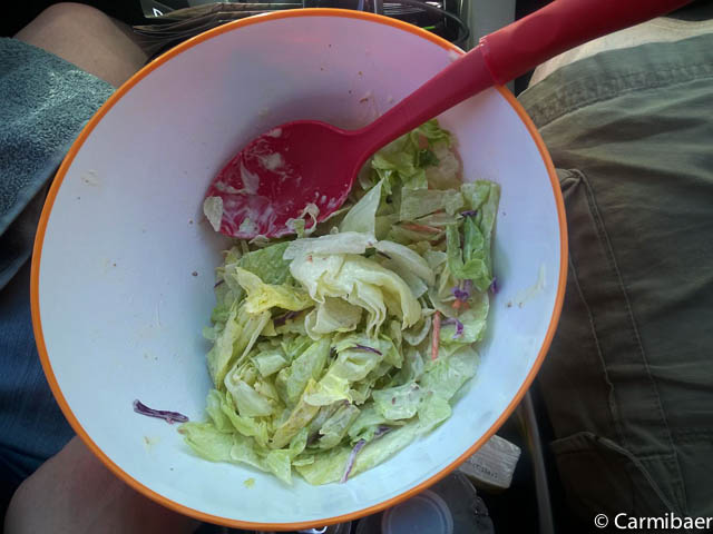 Am Vista Point haben wir aber solchen Hunger, dass wir dort einfach rausfahren und uns unseren Salat machen und ihn einfach im Auto essen. Da ist wenigstens von oben Schatten. Außerdem weht noch ein laues Lüftchen das man mit offenen Fenstern es gerade noch so aushalten kann.