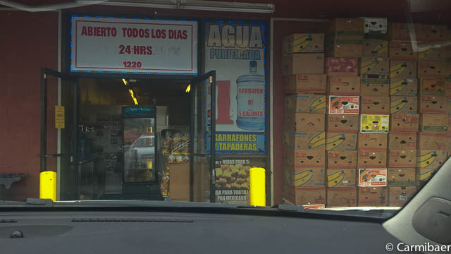 Heute wurden wir durch Lärm von Arbeitern um 6:55 Uhr geweckt. Dabei hätten wir doch so schön schlafen können. Naja, was soll’s. Wir machen uns ganz in Ruhe fertig, haben noch ein wenig im Internet gesurft und sind um 9:20 Uhr losgefahren. Vorher waren wir natürlich frühstücken. Das war sogar ganz toll, denn hier kann man sich unter verschiedenen warmen Gerichten etwas aussuchen was einem frisch zubereitet an den Tisch gebracht wird. Außerdem gibt es frisches Obst und Toast und noch ein paar Cornflakes mit Milch. Da wir heute beschlossen haben nicht mehr nach L.A. zu fahren, weil uns gestern der Verkehr zu viel war, sind wir als erstes Waschen gefahren. Denn waschen müssen wir schon einmal im Urlaub und dann ist es egal, ob heute oder morgen. Es ist hier schon etwas abenteuerlich hier zu waschen, denn der Waschsalon ist irgendwie in einem mexikanischen Viertel. Und so ganz unter Mexikanern mit Spanisch ist schon komisch. Ich bleib da lieber im Auto sitzen. Hier ist es hoffentlich sicher. Dieser Laden hat gefühlt von außen nur aus Bananenkisten bestanden.
