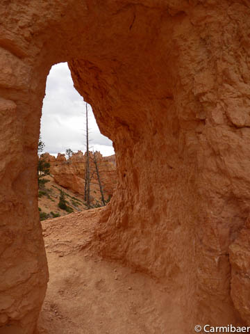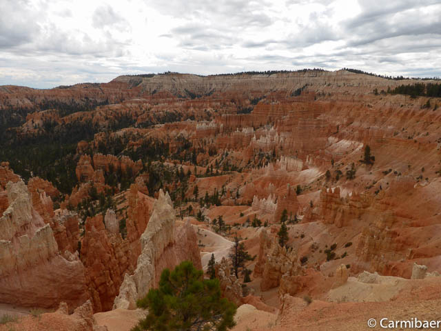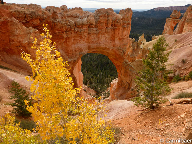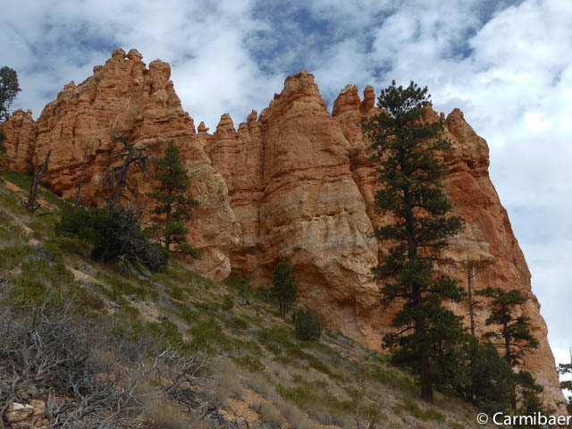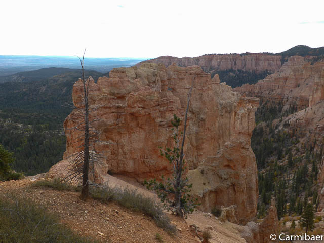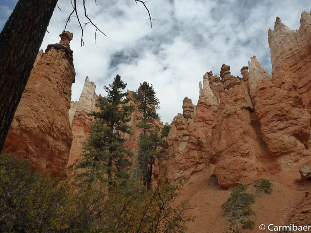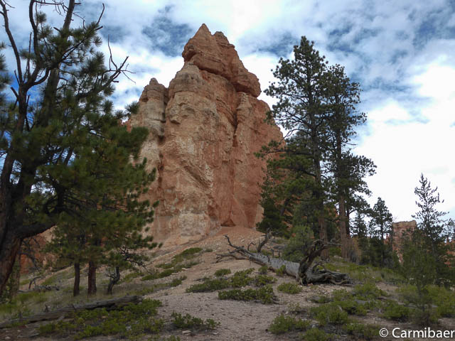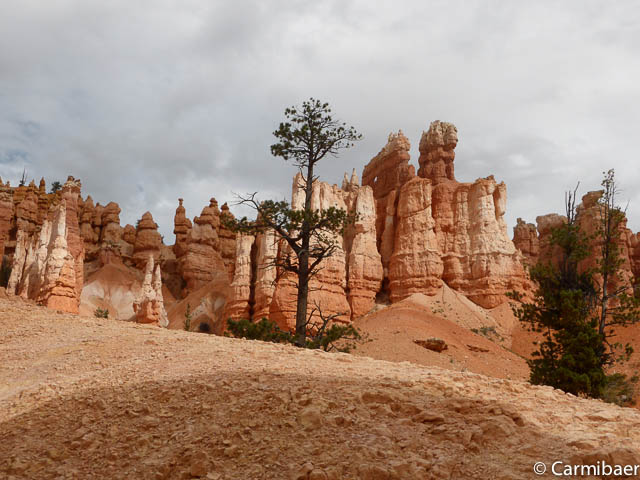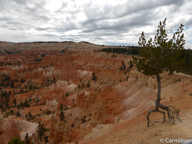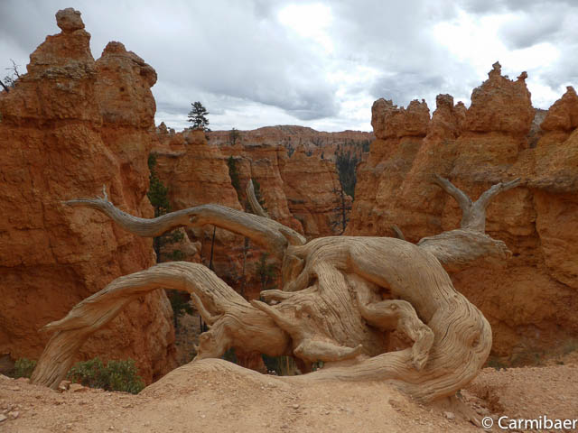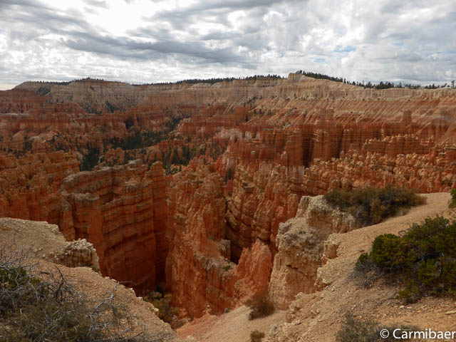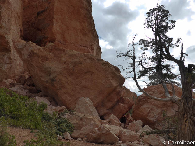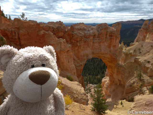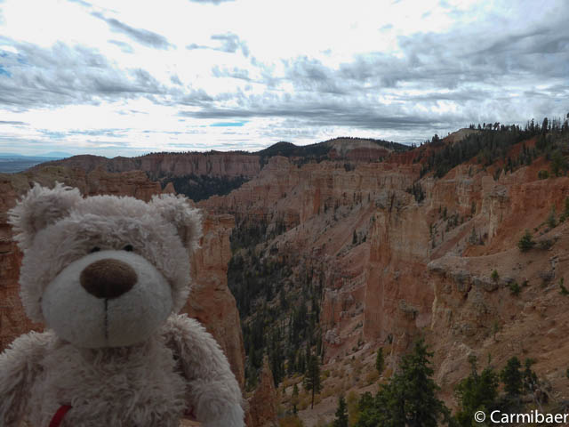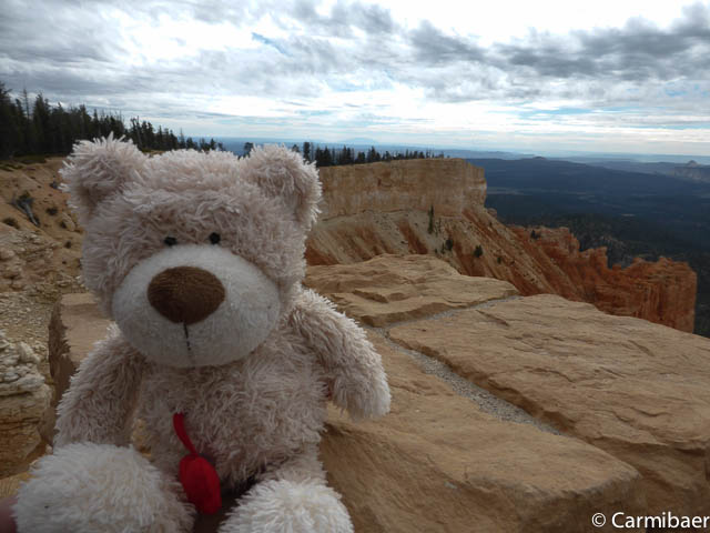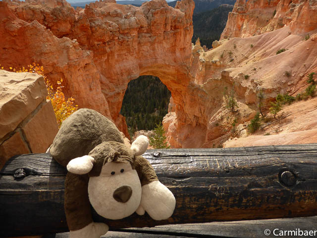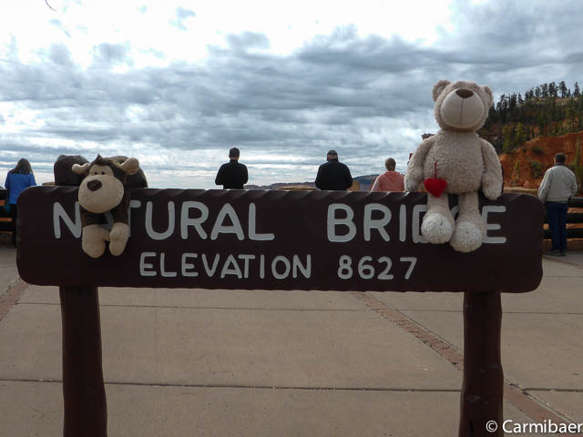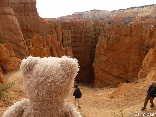 Carmen läuft um 11:50 h den Navajo/Queens Garden Trail mit dem Glücksbären alleine. Knut hat seit heute morgen Kopfschmerzen und bleibt oben am Rim. Wir haben ja bis zum Rangertalk noch jede Menge Zeit und wirklich weg von hier wollen wir nicht, wenn wir schon einmal einen super tollen Parkplatz in so kurzer Zeit ergattert haben. ![]()