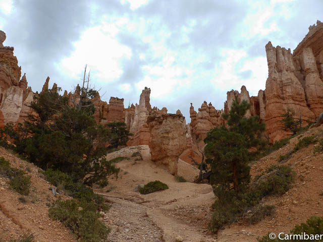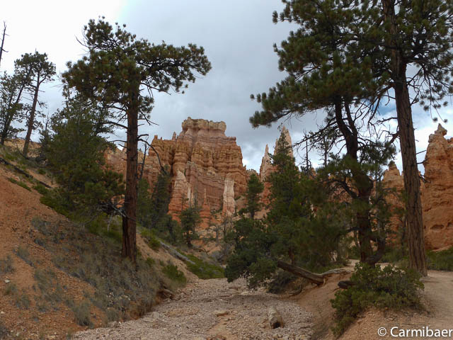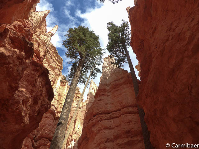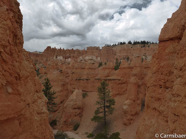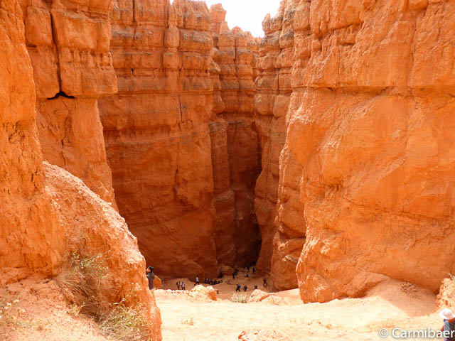 Jetzt geht es unten auf ebener Fläche ein Stück weiter. Hier wird es schon merklich ruhiger und es sind weniger Leute unterwegs, da viele den Navajo Loop nach oben gehen. Aber Carmen nimmt den etwas weiteren Weg in Angriff. Ausserdem kennt sie ihn schon und findet ihn wunderschön. Ich auch, auch wenn ich ihn leider immer nur auf Bildern zu Gesicht bekomme. Aber ich begnüge mich eben immer mit der Aussicht von oben, die einfach auch gigantisch ist.