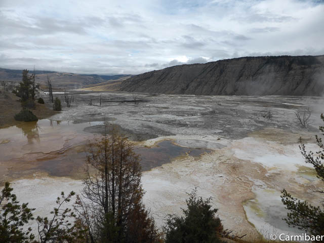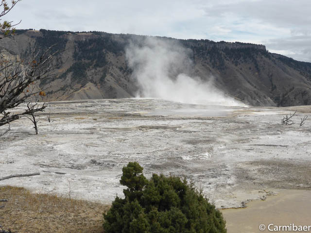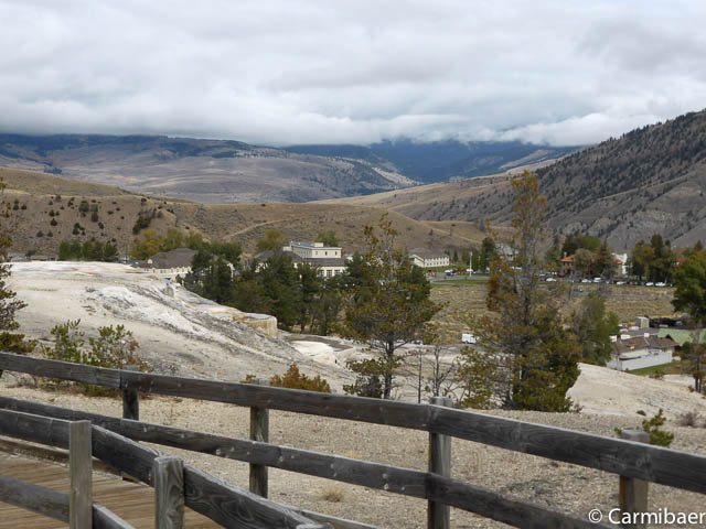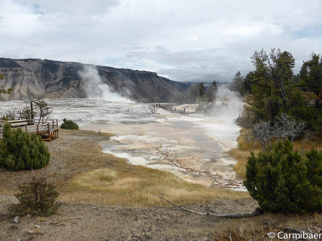 Am Eintrittshäuschen haben wir heute auch unseren Ausweis gebraucht. Bis jetzt meint es der Wettergott gut mit uns. Es ist trocken. Hoffen wir mal das es so bleibt. Als erstes geht es im Mamoth Hot Springs ins Visitorcenter.
