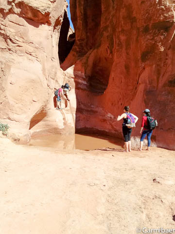 Hier halten wir uns ca. 20 Minuten auf bevor wir uns zum Peek a Boo aufmachen. Der Eingang ist gleich um die Ecke. Allerdings muss man erst ein Wasserloch und eine ca. 3 m hohe Wand überwinden bevor man in den Canyon kommt. Das lassen wir ma schön sein. Vier andere bemühen sich gerade dort rein zu kommen. Zwei haben es geschafft als wir weiter gehen.
