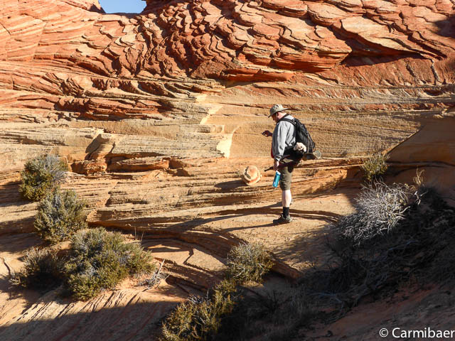 Und die Fahrt geht um 13:10 h weiter. Jetzt geht es noch zur White Pocket. Das ist letztes Jahr irgendwie vergessen worden. Der Weg dorthin ist mehr als bumpy. Um 13:55 h sind wir am Trailhead der White Pocket angekommen.