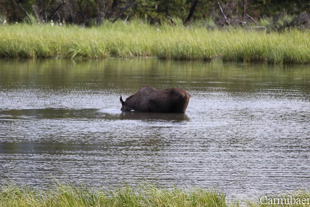 Kurz vor Tok stand plötzlich nach einer Kurve ein Auto am Strassenrand und Carmen hat noch gerade den Elch im Teich gesehen. Daraufhin sind wir ein paar Meter zurück gefahren, damit wir den Elch auch sehen können. Ausgestiegen sind wir natürlich auch, damit wir ihn auch richtig vor die Kamera bekommen. Der sah schon niedlich aus, wie er da mitten im Teich stand und genüsslich sein Abendessen gesucht hat. ![]()
