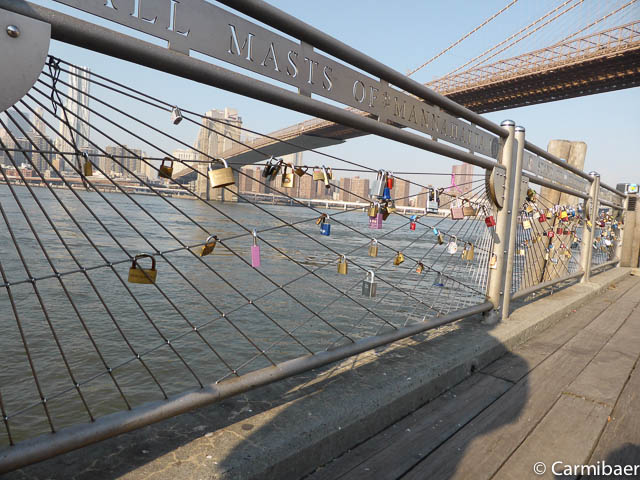 Unterhalb der Brooklyn Bridge gibt es eine kleine Plattform, wo auch ein paar Schlösser angebracht sind. Dies erinnert uns irgendwie an Köln. Das ist wohl im Moment groß in Mode, dass man Schlösser an Brücken befestigt und den Schlüssel dann ins Wasser wirft, um seine Liebe für die Ewigkeit zu besiegeln.
