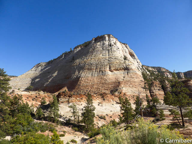 Unterwegs kurz vorm Zion kommen wir wieder an der schönen Bank vorbei. An diese Bank konnte ich mich von 2009 noch erinnern und habe gehofft, dass ich diese wiederfinde. Und es war gar nicht schwierig. Ich meine sogar, dass sie seit dem einen neuen Anstrich erhalten hat. Ich finde es klasse, dass es diese noch gibt und so halten wir an und wir bekommen das erste gemeinsame Bild auf dieser Reise. Beim Aussteigen hat Carmen fast den kleinen Wassergraben übersehen, aber im letzten Moment ist sie noch drübergesprungen und wir sind alle nicht nass geworden. Was für ein Schreck, nur wegen der Bank.